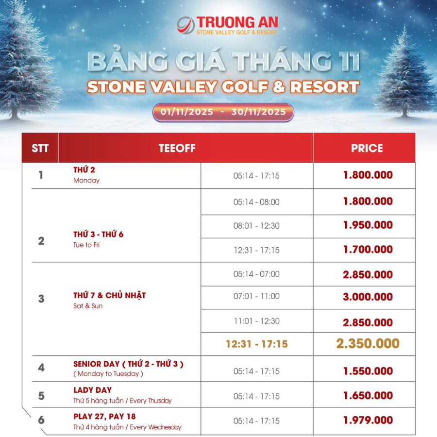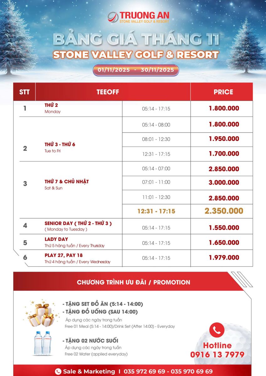 Khởi đầu tháng 11 đầy cảm hứng tại Stone Valley Golf & Resort với bảng giá mới hấp dẫn dành cho golfer. Nhiều ưu đãi đặc biệt như Senior Day, Ladies’ Day và Play 27, Pay 18. Đặt sân ngay để tận hưởng trải nghiệm golf đẳng cấp giữa thiên nhiên tuyệt đẹp của Stone Valley!