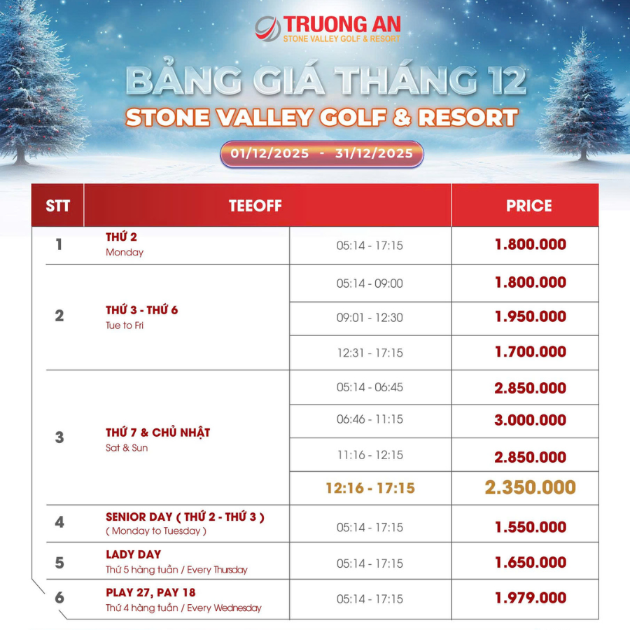 Stone Valley Golf & Resort xin gửi đến quý golfer Bảng giá tháng 12/2025 với nhiều khung giờ linh hoạt và ưu đãi hấp dẫn dành cho Senior Day, Ladies’ Day và chương trình Play 27, Pay 18. Vui lòng đặt sân sớm để giữ tee time đẹp trong mùa cao điểm cuối năm.