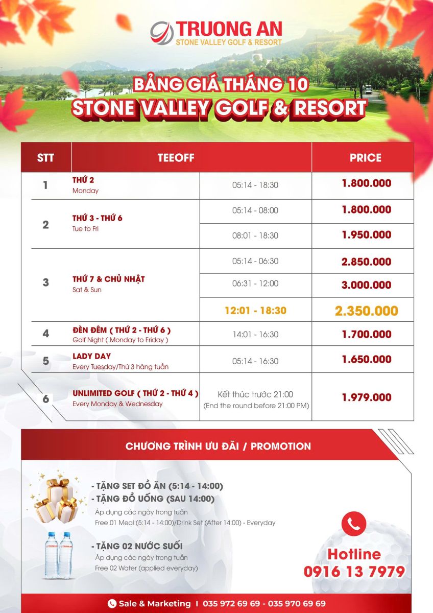 Stone Valley Golf & Resort xin trân trọng gửi đến Quý Golfer bảng giá chơi golf tháng 10/2025 với nhiều khung giờ và ưu đãi hấp dẫn: